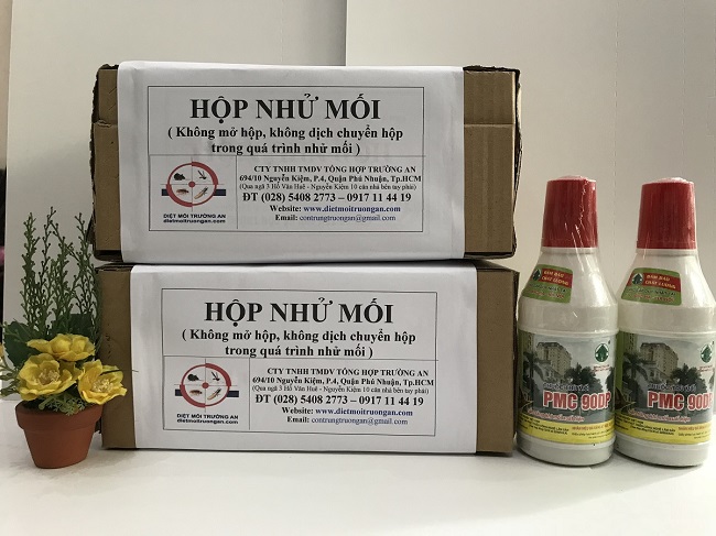- Đóng gói: 01 lọ thuốc diệt mối pmc 90 + 02 Hộp nhử mối